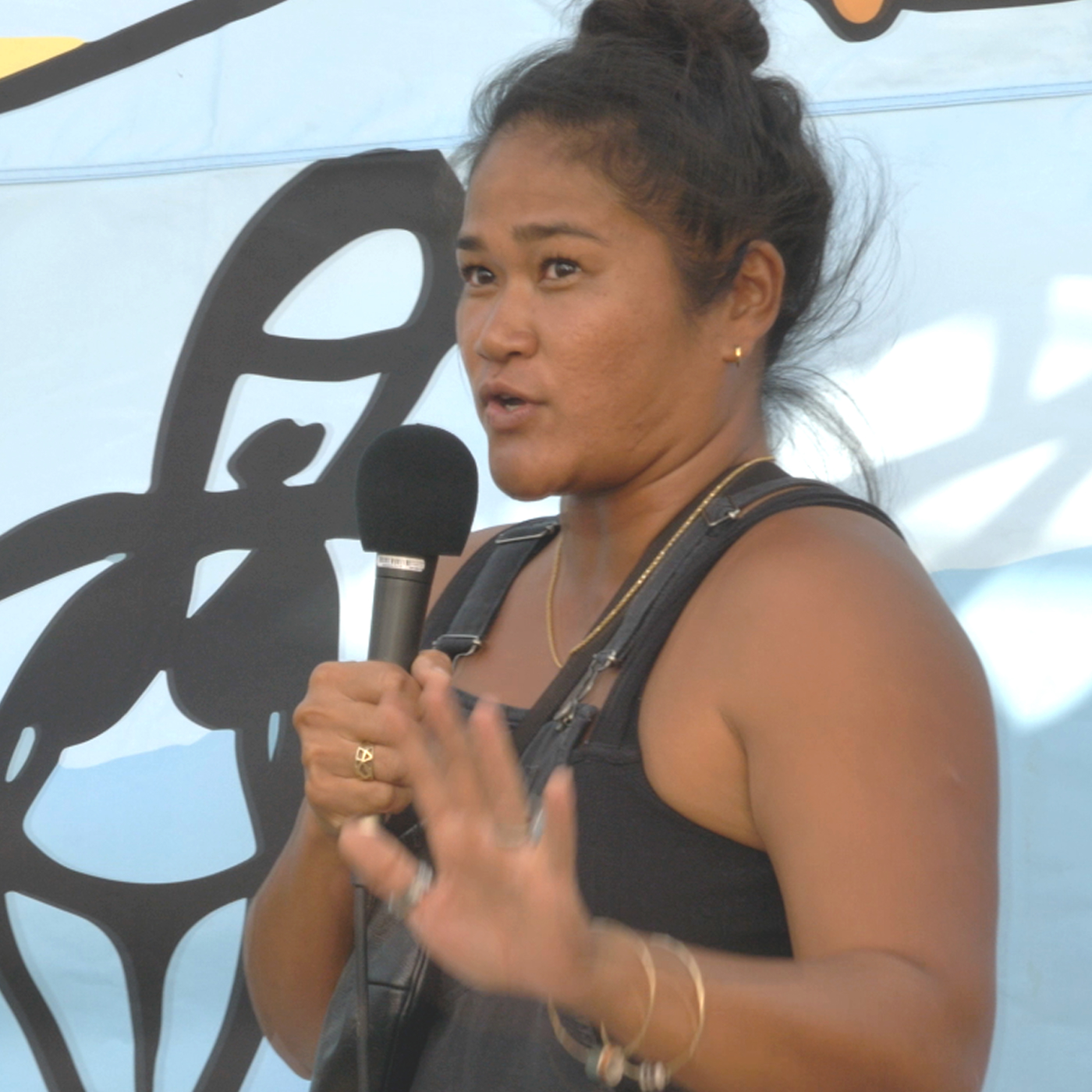 コンテンスト優勝者に贈られたオリジナルボードを作ってくれたシェイパーのメーガンさん、彼女が表彰式で子どもたちに向かって言いました。